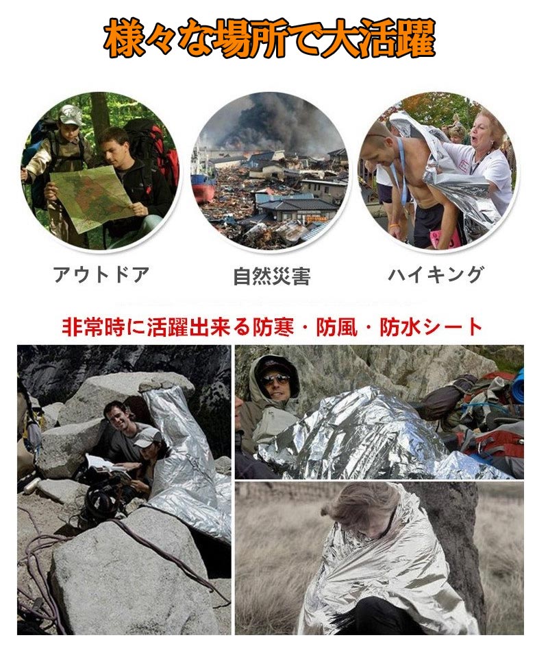 【多用途】天候の急変などの非常時に雨・気温の変化から身を守るためのサバイバルシート(保温シート)です。応急処置用品として、また海・山へのレジャー用品としてもお使いいただけます。防災シート、防寒シート、登山用ブランケット、サバイバルブランケット、防災ブランケット、防寒ブランケット、あったかアルミシート、あったかブランケット、アウトドアブランケットと多用可能です。